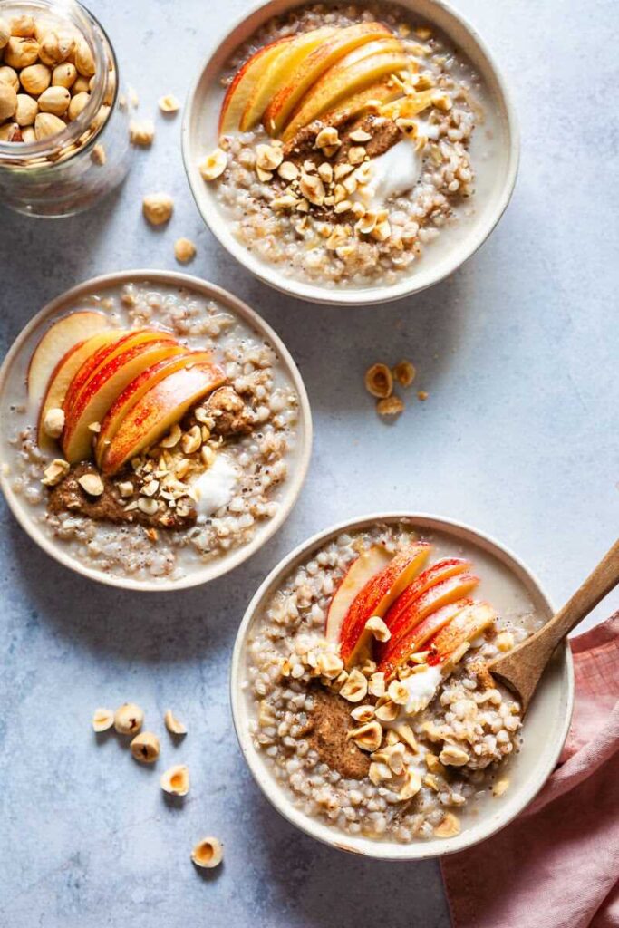 Lavar la manzana, quitarle el corazón y cortarla en dados finos. Ahora añade los cubos de manzana con la leche de almendras, el zumo de manzana y la canela al trigo sarraceno y deja que todo se hinche a fuego lento durante unos 5 minutos. Remover una y otra vez.